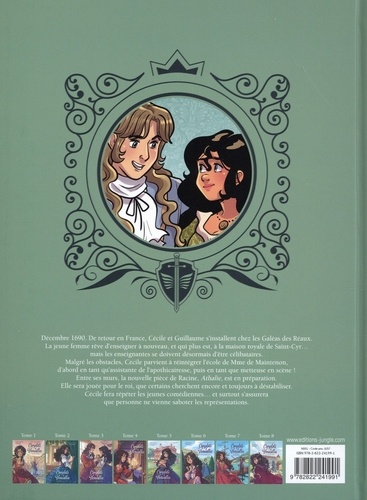 Décembre 1690. De retour en France, Cécile et Guillaume s'installent chez les Galéas des Réaux. La jeune femme rêve d'enseigner à nouveau, et qui plus est, à la maison royale de Saint-Cyr... mais les enseignantes se doivent désormais d'être célibataires. Malgré les obstacles, Cécile parvient à réintégrer l'école de Mme de Maintenon, d'abord en tant qu'assistante de l'apothicairesse, puis en tant que metteuse en scène ! Entre ses murs, la nouvelle pièce de Racine, Athalie, est en préparation. Elle sera jouée pour le roi, que certains cherchent encore et toujours à déstabiliser. Cécile fera répéter les jeunes comédiennes... et surtout s'assurera que personne ne vienne saboter les représentations.