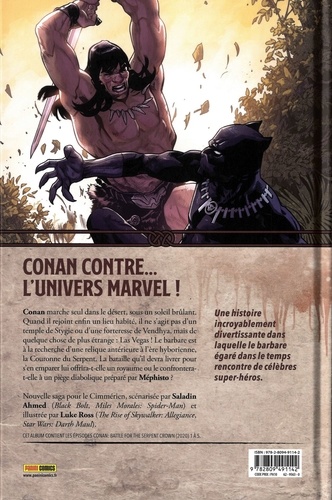 Coincé dans un monde peuplé de super-héros et de technologie, Conan le Barbare cherche sa place. S'il ne trouve dans le désert aucune trace de sa vie d'antan, il y découvre en revanche une ville illuminée, symbole de modernité : Las Vegas ! Il part alors en quête de la Couronne du Serpent, une relique d'Atlantis qui pourrait lui permettre de retrouver un royaume. Mais n'est-ce pas un piège de Méphisto, qui a élu résidence dans la ville du péché ? La quête de Conan va en tout cas attirer l'attention de bien des héros, dont la Chatte Noire et la Panthère Noire ! Saladin Ahmed a le vent en poupe depuis que sa série sur l'Inhumain Flèche Noire a remporté l'Eisner Award de la meilleure nouvelle série. La Maison des Idées lui a confié une tâche importante en lui demandant de participer à l'intégration de Conan le Barbare dans l'univers des super-héros Marvel, l'un des grands événements comics de ces dernières années.