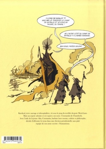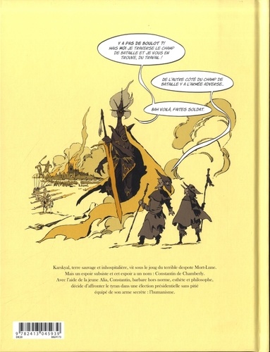 Constantin, né de l'union d'une mère barbare et guerrière et d'un père esthète et lettré, est un barbare différent des autres dès son enfance et il se donne pour mission d'éveiller la terre de Karskyal à l'humanisme. Barbare sensible et philanthrope, Constantin parcourt le monde sauvage de Karskyal pour le convertir aux luttes sociales et aux Lumières. Il rencontre Alia qui veut également découvrir le monde, surtout pour se battre. Ils feront équipe, elle armée de son épée, lui de ses livres, et surmonteront plusieurs épreuves jusqu'à affronter le despote Mort-Lune lors d'une campagne électorale improbable.