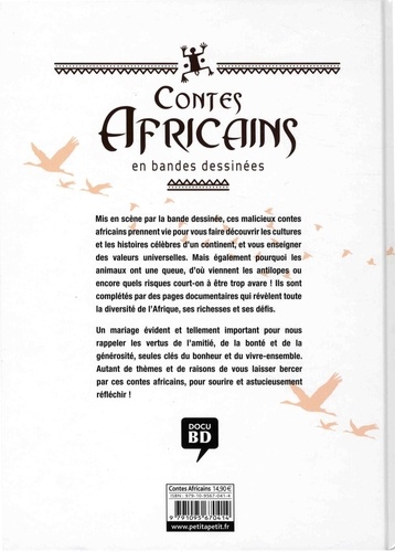 Mis en scène par la bande dessinée, ces malicieux contes africains prennent vie pour vous faire découvrir les cultures et les histoires célèbres d'un continent, et vous enseigner des valeurs universelles. Mais également pourquoi les animaux ont une queue, d'où viennent les antilopes ou encore quels risques court-on à être trop avare ! Ils sont complétés par des pages documentaires qui révèlent toute la diversité de l'Afrique, ses richesses et ses défis. Un mariage évident et tellement important pour nous rappeler les vertus de l'amitié, de la bonté et de la générosité, seules clés du bonheur et du vivre-ensemble. Autant de thèmes et de raisons de vous laisser bercer par ces contes africains, pour sourire et astucieusement réfléchir !