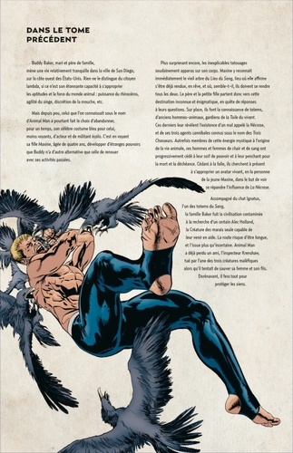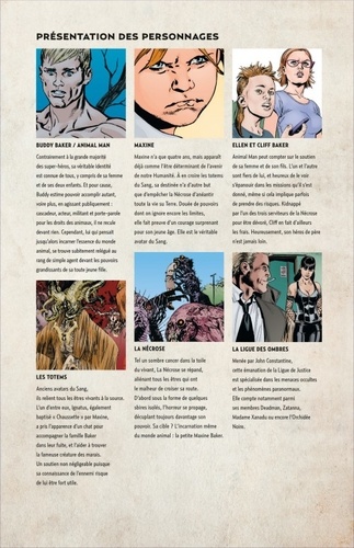 Depuis la découverte du lien unissant la jeune Maxine avec le Sang, force mystique incarnant le règne animal sur Terre, Buddy Baker et sa famille fuient la civilisation contaminée par la Nécrose. Tandis que l'Humanité toute entière se transforme progressivement en créatures de cauchemars, Buddy disparaît, happé hors de ce monde. Fort heureusement, Ellen, sa femme, et son fils Cliff reçoivent l'aide providentielle de John Constantine et de la Ligue des Ombres. Animal Man est l'occasion de retrouver un personnage créé en 1965 par le scénariste Dave Wood et le dessinateur Carmine Infantino, repris ensuite par Grant Morrison à la fin des années 80. Imaginées par Jeff Lemire (Sweet Tooth) et illustrées par Steve Pugh, les nouvelles aventures du héros annoncent le retour au premier plan de cette série au ton résolument adulte, en lien direct avec les événements de la série Swamp Thing, réalisée par Scott Snyder et Yanick Paquette. À ce titre, la suite de ce tome est à lire dans le tome 2 de Swamp Thing.