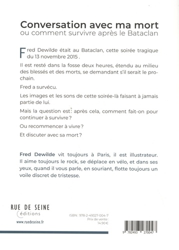 Dans ce roman graphique, Fred racont, e de manière poignante et sidérante par sa force, ce que c'est, 4 ans après, que de vivre avec sa propre Mort en horizon. Fred Dewilde était dans la fosse au Bataclan ce jour-là, le sinistre 13 novembre 2015. Il est resté couché dans les flaques de sang en entendant siffler les balles autour de lui, en voyant les chaussures des assassins passer à 15 cm de son visage. Il a tenu pendant 4 heures la main d'une jeune fille gravement touchée, elle aurait pu être sa fille. Il s'en est sorti vivant, mais la Mort réclame toujours un prix .