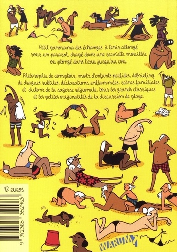Petit panorama des échanges à tenir allongé sous un parasol drapé dans une serviette mouillée ou plongé dans l'eau jusqu'au cou. Philosophie de comptoir, mots d'enfants perfides, debriefing de dragues subtiles, déclarations enflammées, scènes familiales et dictons de la sagesse régionale, tous les grands classiques et les petites originalités de la discussion de plage.