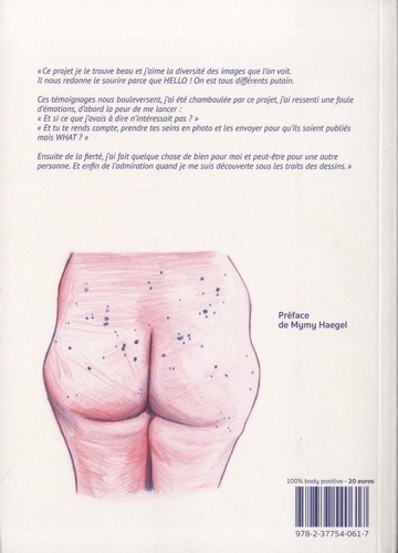 "Ce projet je le trouve beau et j'aime la diversité des images que Ibn voit. Il nous redonne le sourire parce que HELLO ! On est tous différents putain. Ces témoignages nous bouleversent, j'ai été chamboulée par ce projet, j'ai ressenti une foule d'émotions, d'abord la peur de me lancer : Et si ce que j'avais à dire n'intéressait pas ? " Et tu te rends compte, prendre tes seins en photo et les envoyer pour qu'ils soient publiés mais WHAT ? " Ensuite de la fierté, ai fait quelque chose de bien pour moi et peut-être pour une autre personne. Et enfin de l'admiration quand je me suis découverte sous les traits des dessins."