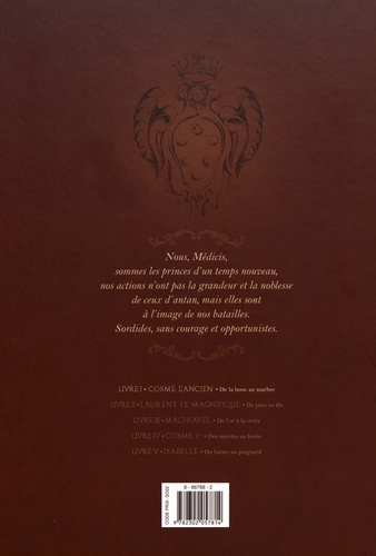 Une fresque violente et passionnée, mêlant histoire de l'art, guerre et complot, amitiés, amour et trahison. Oubliez les livres d'histoire, écoutez la voix de Florence, revivez l'épopée de ceux qui l'ont écrite... la saga des Médicis. Qui sont les Médicis ? Banquiers, tyrans, humanistes, conspirateurs, visionnaires, artistes, guerriers, assassins... De générations en générations, ils ont façonné la Renaissance, influencé le destin de l'Italie comme de l'Europe, sont devenus l'une des familles les plus riches du monde, ont côtoyé de grands rois, des artistes tels que Michel-Ange et De Vinci, ont donné deux reines à la France et trois papes à la chrétienté... Leur maison a marqué l'Histoire, pourtant, les premiers Médicis n'étaient que de petits usuriers. Voici le récit de leur irrésistible ascension. Le jeune Cosme porte un nom de famille encore inconnu. D'origine roturière, fils d'un banquier de Florence, il ne voit dans l'argent qu'un moyen de s'élever au-dessus des nobles, de sortir sa cité et le reste du monde du Moyen-âge. Il nourrit les ambitions d'un roi. Mais en un temps où les grands de Florence, le Pape et les seigneurs d'Italie s'affrontent au moindre prétexte, lui qui n'a jamais brandi d'épée va devoir livrer des batailles nouvelles... Celles qui se gagnent par la patience et l'esprit. Ainsi seulement le nom des Médicis épousera les lumières de l'Histoire.