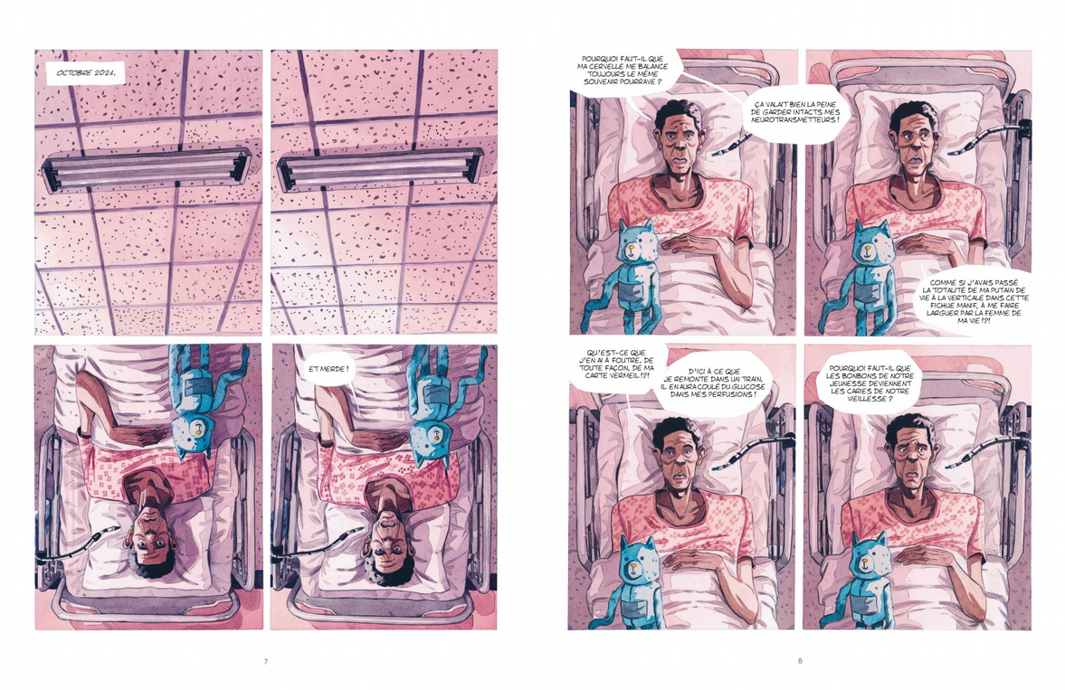 Entre souvenirs, regrets et visites de ses proches, il livre un récit intime et bouleversant. Porté par un dessin clair aux couleurs douces, ce roman graphique met en lumière la dureté de sa condition sans jamais sombrer. L’humour, toujours présent, allège la gravité et fait de Virgile une œuvre aussi touchante que lumineuse.