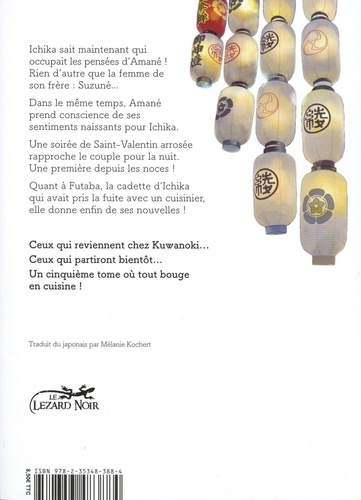 Ichika sait maintenant qui occupait les pensées d'Aman ! Rien d'autre que la femme de son frère : Suzuné... Dans le même temps, Amené prend conscience de ses sentiments naissants pour Ichika. Une soirée de Saint-Valentin arrosée rapproche le couple pour la nuit. Une première depuis les noces ! Quant à Futaba, la cadette d'Ichika qui avait pris la fuite avec un cuisinier, elle donne enfin de ses nouvelles ! Ceux qui reviennent chez Kuwanoki... Ceux qui partiront bientôt... Un cinquième tome où tout bouge en cuisine !