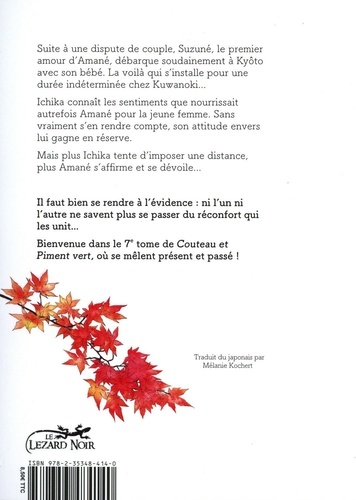Suite à une dispute de couple, Suzuné, le premier amour d'Amané, débarque soudainement à Kyôto avec son bébé. La voilà qui s'installe pour une durée indéterminée chez Kuwanoki... Ichika connaît les sentiments que nourrissait autrefois Amane pour la jeune femme. Sans vraiment s'en rendre compte, son attitude envers lui gagne en réserve. Mais plus Ichika tente d'imposer une distance, plus Amané s'affirme et se dévoile... Il faut bien se rendre à l'évidence : ni l'un ni l'autre ne savent plus se passer du réconfort qui les unit... Bienvenue dans le 7e tome de Couteau et Piment vert, où se mêlent présent et passé !