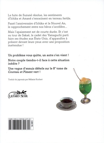 La fuite de Suzuné résolue, les sentiments d'Ichika et Amané s'enracinent en terreau fertile. Passé l'anniversaire d'Ichika et le Nouvel An, le rapprochement entre nos héros s'accélère... Mais l'apaisement est de courte durée. Et c'est au tour de Sakaé, le cadet des Yamaguchi parti faire ses études aux Etats-Unis, d'apparaître à présent devant leurs yeux avec une proposition inattendue ! Un problème vous quitte, un autre s'en vient ! Notre couple tiendra-t-il face à cette situation inédite ? Une vague d'ennuis déferle sur le 8e tome de Couteau et Piment vert !