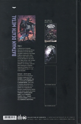 Le Batman qui rit possède désormais les pouvoirs du Docteur Manhattan et est bien décidé à remodeler le Multivers à son image. Il défie sa créatrice elle-même, Perpetua, après s'être lancé aux trousses des Flash au coeur de la Force Véloce. De leur coté, les héros de la Ligue de Justice tentent d'élaborer une stratégie contre ces êtres surpuissants et Batman, Superman et Wonder Woman se voient projetés au coeur de trois Crises du passé. BATMAN, DEATH METAL présente le nouvel événement d'ampleur imaginé par Scott SNVDER et Greg CAPULLO, déjà aux commandes de BATMAN et de BATMAN METAL. Cette suite, à l'ambition démentielle et au déroulement tonitruant, est ici publiée avec l'intégralité des épisodes complémentaires réalisés par des auteurs réputés tels James TYNION IV (FUSTIGE LEAGUE DARK), Francis MANAPUL (FLASH), Peter J. TOMASI (BATMAN & ROBIN) ou bien encore Eddy BARROWS (NIGHTWING).
