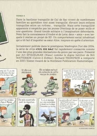 Tome 3. Dans la banlieue tranquille de Cul de Sac vivent de nombreuses familles au quotidien tout aussi tranquille, élevant leurs enfants tranquilles selon un rythme... tranquille. Mais cette tranquillité apparente n'empêche pas les jeunes Otterloop de se poser mille et une questions. Grand timide solitaire à l'imagination débordante, Petey fait la connaissance d'André et de Loris, deux "amis" avec lesquels il réalise un projet de BD. Un comportement social inhabituel qui a tôt fait d'inquiéter sa soeur Alice, toujours en quête d'attention.