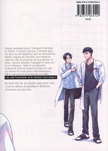 Tadayuki est un jeune docteur ordinaire. Jusqu'au jour où son corps change sans explication : il est pris d'une étrange soif de sang, et le temps semble soudain ne plus avoir de prise sur lui. Il en vient même à attaquer son collègue ! Il tente ensuite de disparaître de sa vie, mais celui-ci le rattrape et lui propose son aide. Il promet de l'aider à comprendre son changement de condition, et même de le nourrir de son sang. A ce moment-là, ils ignorent tous deux que c'est le début d'une relation qui durera des décennies... Une histoire déchirante sur une relation unique ! Le mythe du vampire exploré à l'echelle d'une vie. ETRE UN VAMPIRE NOUS CONDAMNE -T- IL A LA SOLITUDE ?