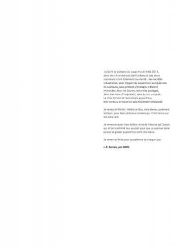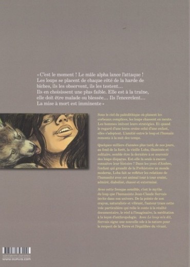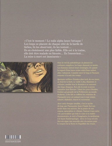 "C'est le moment ! Le mâle alpha lance l'attaque ! Les loups se placent de chaque côté de la harde de biches, ils les observent, ils les testent... Ils en choisissent une plus faible. Elle est à la traîne, elle doit être malade ou blessée... Ils l'encerclent... La mise à mort est imminente". Sous le ciel du paléolithique où planent les corbeaux complices, les loups chassent en meute. Les hommes imitent leurs stratégies. Et quand le regard d'une louve croise celui d'une enfant, elles s'adoptent. L'amitié entre le loup et l'humain remonte à la nuit des temps. Quelques milliers d'années plus tard, de nos jours, au fond de la forêt, la vieille Loba, illuminée et solitaire, semble être la dernière à se souvenir des loups disparus. Est-elle la seule à encore connaître leur histoire ? Dans les yeux d'Ambre, l'enfant qui grandit de la Préhistoire au monde moderne, Loba fait se refléter les relations de l'humanité avec cet animal tour à tour craint, admiré, diabolisé, chassé et exterminé. Avec cette fresque sensible, c'est le mythe du loup que l'humaniste Jean-Claude Servais invite dans son univers. De la pointe de son crayon, naturaliste et vibrant, l'auteur trace cette voie particulière qui relie le conte à la réalité documentaire, le réel à l'imaginaire, la méditation à la leçon d'anthropologie. Avec Le loup m'a dit, Servais signe une nouvelle ode à la nature pour le respect de la Terre et l'équilibre du vivant.