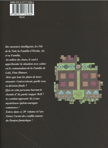 Des monstres intelligents, les Fils de la Nuit, la Familia d'Hestia, Aiz et sa Familia. Au milieu du chaos, le seul à appréhender la situation avec calme est le commandant de la Familia de Loki, Finn Dimner. Alors que tous les plans de leurs ennemis s'entrecroisent, quelle sera sa décision finale ? Qui est cette personne barrant le chemin d'Aiz partie stopper Bell ? Le combat opposant Aiz à une mystérieuse épéiste-ouragan commence ! Entrez dans ce 20e volume et l'arc Xénoi, l'acmé des conflits autour du Donjon fantastique !