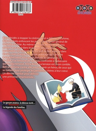 Bien décidés à stopper la cérémonie et à délivrer Haruhime, Bell et Mikoto enfoncent les portes du quartier général de la familia d'Ishtar. Au même moment, Hestia et ses amis arrivent eux aussi dans le quartier des plaisirs. La situation est explosive, le fire bolt de Bell explose dans mes airs, mais chaque minuscule avantage qu'il arrache à ses adversaire n'est qu'un prélude au désespoir... En effet, il se retrouve de nouveau confronté à l'adversaire qui l'a déjà terrassé, Aïsha Berka. La tension est à son comble. Bell se démène contre elle pour devenir un héros, de ceux qui se battent pour protéger les personnes chères à leur coeur. Un dernier combat pour délivrer une princesse emprisonnée... Le garçon, avance, la déesse écrit... La légende des familias.