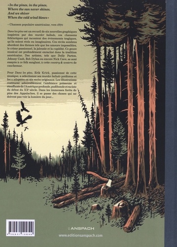 "In the pines, in the pines, Where the sun never shines, And we shiver When the cold wind blows " - Chanson populaire américaine, vers 1870 Dans les pins est un recueil de six nouvelles graphiques inspirées par des murder ballads, ces chansons folkloriques qui racontent des événements tragiques, qu'ils soient réels ou imaginaires. Ces récits sombres abordent des thèmes tels que les amours impossibles, le crime passionnel, la jalousie et la cupidité. Ce genre musical est profondément enraciné dans la tradition américaine. Des artistes, tels que Dolly Parton, Johnny Cash, Bob Dylan ou encore Nick Cave, se sont essayés à ce folk sanglant, à cette country & western de cauchemar. Pour Dans les pins, Erik Kriek, passionné de cette musique, a sélectionné ses murder ballado préférées et les a adaptées en six récits originaux. Les illustrations restituent admirablement l'ambiance poisseuse et étouffante de l'Amérique profonde, pudibonde et raciste du début du XXe siècle. Dans les immenses forets de pins des Appalaches, il se passe des choses qui ne doivent pas voir la lumière du jour...