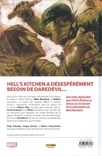 Daredevil a du sang sur les mains et Matt Murdock ne peut plus l'ignorer. Le héros va prendre une décision qui pourrait mettre un terme définitif à sa carrière : il va assister au procès de Daredevil ! Mais en l'absence du Diable de Hell's Kitchen, qui peut reprendre le flambeau pour protéger New York ? Cette saga phénoménale de Chip Zdarsky (Spider-Man : L'Histoire d'une vie) ne peut que passionner les amateurs du Diable rouge. Un album à ne pas manquer s'achevant par un retournement de situation qui fera longtemps parler de lui !