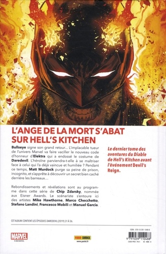 Bullseye signe son grand retour... l'implacable tueur de l'univers Marvel va faire vaciller le nouveau code d'honneur d'Elektra qui a endossé le costume de Daredevil. L'héroïne parviendra-t-elle à se maîtriser face à celui qui l'a déjà vaincue et humiliée ? Pendant ce temps, Matt Murdock purge sa peine de prison, incognito, et s'apprête à découvrir un secret bien caché derrière les barreaux... Rebondissements et révélations sont au programme dans cette série de Chip Zdarsky, nommée aux Eisner Awards. Le scénariste s'entoure ici des artistes Mike Hawthorne, Marco Checchetto, Stefano Landini, Francesco Mobili et Manuel Garcia.