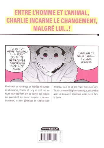 Charlie est un humanzee, un hybride mi-humain mi-chimpanzé. Charlie et Lucy se sont mis en route pour New York afin de trouver des indices qui pourraient les mener jusqu'au professeur Grossman, le père génétique de Charlie. Bien entendu, l'ALA ne va pas rester sans rien faire. De plus, une société pharmaceutique, qui semble avoir un lien avec Grossman, entre aussi dans la danse !