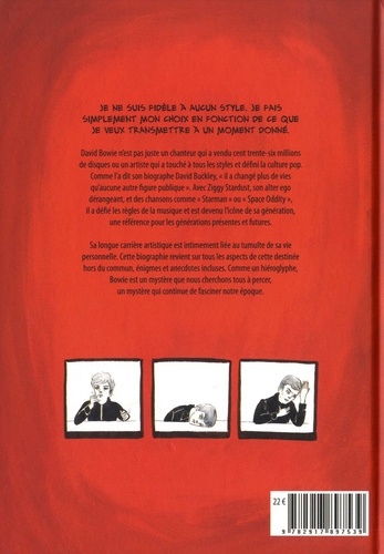 David Bowie n'est pas juste un chanteur qui a vendu cent trente-six millions de disques ou un artiste qui a touché à tous les styles et défini la culture pop. Comme l'a dit son biographe David Buckley, " il a changé plus de vies qu'aucune autre figure publique ". Avec Ziggy Stardust, son alter ego dérangeant, et des chansons comme " Starman " ou " Space Oddity ", il a défié les règles de la musique et est devenu l'icône de sa génération, une référence pour les générations présentes et futures. Sa longue carrière artistique est intimement liée au tumulte de sa vie personnelle. Cette biographie revient sur tous les aspects de cette destinée hors du commun, énigmes et anecdotes incluses. Comme un hiéroglyphe, Bowie est un mystère que nous cherchons tous à percer, un mystère qui continue de fasciner notre époque.