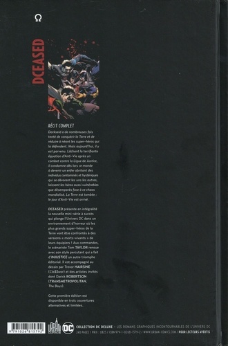Darkseid a de nombreuses fois tenté de conquérir la Terre et de réduire à néant les super-héros qui la défendent. Mais aujourd'hui, il y est parvenu. Lâchant la terrifiante équation d'Anti-Vie après un combat contre la Ligue de Justice, il condamne dès lors ce monde devenir un enfer abritant des individus contaminés et hystériques qui se dévorent les uns les autres, laissant les héros aussi vulnérables que désemparés face à ce chaos mondialisé. La Terre est tombée : le jour d'Anti-Vie est arrivé. DCeased présente en intégralité la nouvelle minisérie à succès qui plonge l'Univers DC dans un environnement d'horreur où les plus grands super-héros de la Terre vont être confrontés à des versions "morts-vivants" de leurs équipiers ! Aux commandes, le scénariste Tom Taylor renoue avec son style percutant qui a fait d'Injustice un autre triomphe éditorial. Il est accompagné au dessin par Trevor Hairsine (Cla$$war) et des artistes invités dont Darick Robertson (Transmetropolitan, The Boys). Cette première édition est disponible en trois couvertures alternatives et limitées.