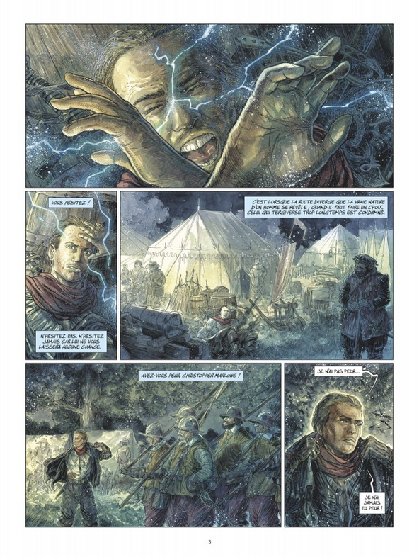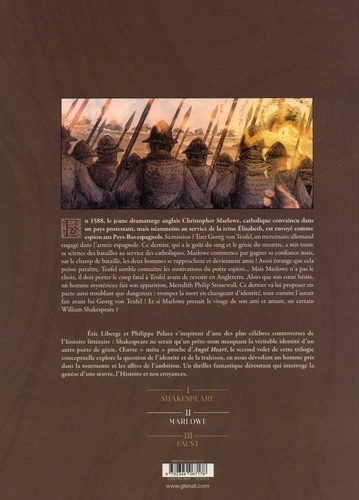 Un poète dans la tourmente. 1588. Le jeune dramaturge anglais Christopher Marlowe, catholique convaincu dans un pays protestant, mais néanmoins au service de la reine Elizabeth, est envoyé comme espion aux Pays-Bas espagnols. Sa mission ? Tuer Georg von Teufel, un mercenaire allemand engagé dans l'armée espagnole. Ce dernier, qui a le goût du sang et le génie du meurtre, a mis toute sa science des batailles au service des Catholiques. Marlowe commence par gagner sa confiance mais, sur le champ de bataille, les deux hommes se rapprochent et deviennent amis ! Aussi étrange que cela puisse paraître, Teufel semble connaître les motivations du poète espion... Mais Marlowe n'a pas le choix, il doit porter le coup fatal à Teufel avant de revenir en Angleterre. Alors que son coeur hésite, un homme mystérieux fait son apparition, Meredith Philip Stonewall. Ce dernier va lui proposer un pacte aussi troublant que dangereux : tromper la mort en changeant d'identité, tout comme l'aurait fait avant lui Georg von Teufel ! Et si Marlowe prenait le visage de son ami et amant, un certain William Shakespeare ? Eric Liberge et Philippe Pelaez s'inspirent d'une des plus célèbres controverses de l'histoire littéraire : Shakespeare ne serait qu'un prête-nom masquant la véritable identité d'un autre poète de génie. Ouvre " méta " proche d'Angel Heart, le second volet de cette trilogie conceptuelle explorela question de l'identité et de la trahison, en nous dévoilant un homme pris dans la tourmente et les affres de l'ambition. Un thriller fantastique déroutant qui interroge la genèse d'une oeuvre, l'Histoire et nos croyances.