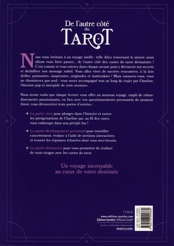 Nous vous invitons à un voyage inédit : telle Alice traversant le miroir, nous allons vous faire passer... de l'autre côté des cartes du tarot divinatoire ! C'est comme si vous entriez dans chaque arcane pour y découvrir ses secrets et déchiffrer son message subtil. Vous allez vivre de sacrées rencontres, à la fois drôles, puissantes, inspirantes, originales et inattendues ! Mais rassurez-vous, vous ne cheminerez pas seul : vous serez accompagné tout au long du trajet par Charline, l'héroïne pop et intrépide de cette aventure. Nous avons voulu que chaque lecture vous offre un nouveau voyage, empli de rebondissements passionnants, en lien avec vos questionnements personnels du moment. Ainsi, vous découvrirez trois portes d'entrées : La partie récit pour plonger dans l'histoire et suivre les pérégrinations de Charline qui, au fil des cases, vous embarque dans son périple fou ! La partie développement personnel pour travailler concrètement, évoluer à l'aide de sections interactives et trouver les réponses éclairées dont vous avez besoin. La partie divinatoire pour vous permettre de réaliser de vrais tirages avec les cartes du tarot. Un voyage incroyable au coeur de votre destinée