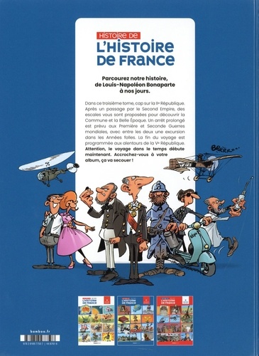 Parcourez notre histoire, de Louis-Napoléon Bonaparte à nos jours. Dans ce troisième tome, cap sur la IIe République. Après un passage par le Second Empire, des escales vous sont proposées pour découvrir la Commune et la Belle Epoque. Un arrêt prolongé est prévu aux Première et Seconde Guerres mondiales, avec entre les deux une excursion dans les Années folles. La fin du voyage est programmée aux alentours de la Ve République. Attention, le voyage dans le temps débute maintenant. Accrochez-vous à votre album, ça va secouer !
