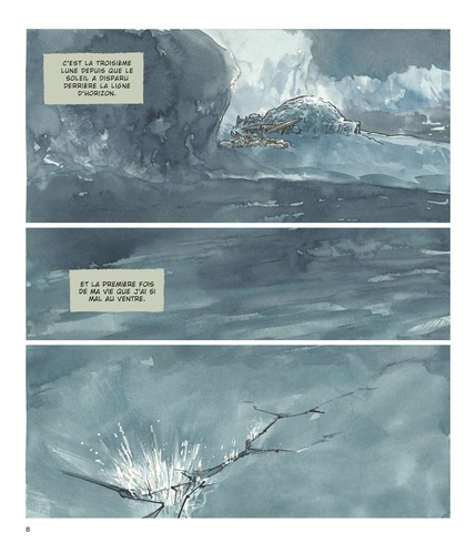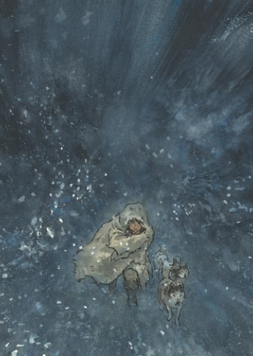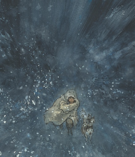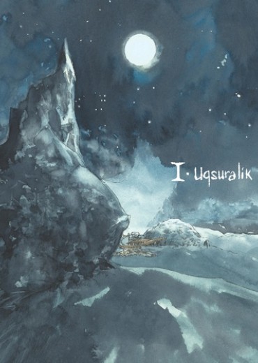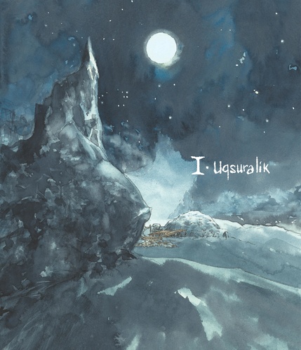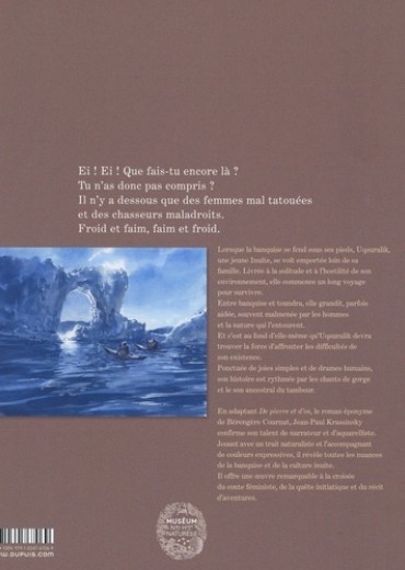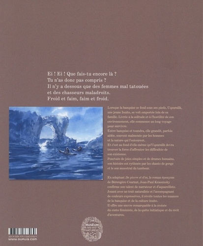 Ei ! Ei ! Que fais-tu encore là ? Tu n'as donc pas compris ? Il n'y a dessous que des femmes mal tatouées et des chasseurs maladroits. Froid et faim, faim et froid. Lorsque la banquise se fend sous ses pieds, Ugsuralik, une jeune (mite, se voit emportée loin de sa famille. Livrée à la solitude et à l'hostilité de son environnement, elle commence un long voyage pour survivre. Entre banquise et toundra, elle grandit, parfois aidée, souvent malmenée par les hommes et la nature qui l'entourent. Et c'est au fond d'elle-même qu'Ugsuralik devra trouver la force d'affronter les difficultés de son existence. Ponctuée de joies simples et de drames humains, son histoire est rythmée par les chants de gorge et le son ancestral du tambour. En adaptant De pierre et d'os, le roman éponyme de Bérengère Cournut, Jean-Paul Krassinsky confirme son talent de narrateur et d'aquarelliste. Jouant avec un trait naturaliste et l'accompagnant de couleurs expressives, il révèle toutes les nuances de la banquise et de la culture inuite. Il offre une oeuvre remarquable à la croisée du conte féministe, de la quête initiatique et du récit d'aventures.
