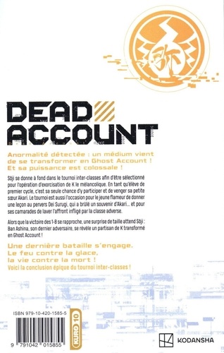 Anormalité détectée : un médium vient de se transformer en Ghost Account ! Et sa puissance est colossale ! Sôji se donne à fond dans le tournoi inter-classes afin d'être sélectionné pour l'opération d'exorcisation de K le mélancolique. En tant qu'élève de premier cycle, c'est sa seule chance d'y participer et de venger sa petite soeur Akari. Le tournoi est aussi l'occasion pour le jeune flameur de donner une leçon au pervers Dei Surugi, qui a brûlé un souvenir d'Akari... et pour ses camarades de laver l'affront infligé par la classe adverse. Alors que la victoire des 1-B se rapproche, une surprise de taille attend Sôji : Ban Ashina, son dernier adversaire, se révèle un partisan de K transformé en Ghost Account ! Une dernière bataille s'engage. Le feu contre la glace, la vie contre la mort ! Voici la conclusion épique du tournoi inter-classes !