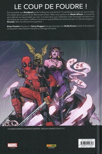 Est-il possible que Deadpool perde la tête pour une femme ? Il semblerait, en tout cas, qu'un coeur d'or batte dans la poitrine du Mercenaire Disert. Mais nous parlons de Wade Wilson, le mutant le plus délirant et imprévisible qui soit, il ne faut donc pas s'attendre à des bouquets de fleurs et à des boites de chocolats ! L'affaire commence quand Wade est missionné par un client prestigieux Dracula. Mais les distractions guettent... Brian Posehn (Deadpool), Gerry Duggan (Savage Avengers) et Reilly Brown (Cable & Deadpool) orchestrent cette histoire menant au mariage du siècle.
