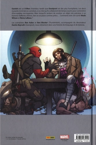 Gambit est un X-Man charmeur, tandis que Deadpool est des plus horripilants. Les deux mutants n'ont rien en commun, si ce n'est qu'ils collaborent de temps à autre pour commettre d'incroyables escroqueries. Mais lorsqu'ils tentent de soutirer un objet très précieux à un homme d'affaires chinois, rien ne se passe comme prévu... Comment vont s'en sortir Wade Wilson et Rémy LeBeau ? Les scénaristes Ben Acker et Ben Blacker (Thunderbolts), accompagnés du dessinateur Danilo Beyruth (Gwenpool), nous entraînent dans une histoire de braquage et de katanas.