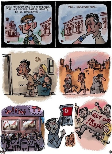 En l'espace de quelques semaines, au printemps dernier, les peuples de l'Egypte, de la Tunisie et de la Lybie ont renversé des régimes autoritaires, dans un espoir de liberté et de démocratie. Cet album rassemble des bandes dessinées de 2 à 4 pages, ainsi que des dessins de Plantu et d'autres humoristes consacrées à ces événements, oeuvres des plus grands dessinateurs du monde entier, à l'initiative du français Plantu, pour rendre hommage à ces journées historiques. L'association Cartooning for Peace/Dessins pour la paix, s'est fixé pour mission de "désapprende l'intolérance", de promouvoir une meilleure compréhension et un respect mutuel entre des populations de différentes croyances ou cultures. "Les dessins de presse nous font rire. Mais c'est aussi une chose sérieuse : ils ont le pouvoir d'informer, mais aussi d'offenser." Koffi Annan, prix Nobel de la Paix, Secrétaire Général des Nations Unies, lors de la fondation de Cartonning for Peace en 2006.