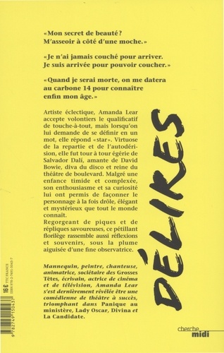 Artiste éclectique, Amanda Lear accepte volontiers le qualificatif de touche-à-tout, mais lorsqu'on lui demande de se définir en un mot, elle répond "star". Virtuose de la repartie et de l'autodérision, elle fut tour à tour égérie de Salvador Dalí, amante de David Bowie, diva du disco et reine du théâtre de boulevard. Malgré une enfance timide et complexée, son enthousiasme et sa curiosité lui ont permis de façonner le personnage à la fois drôle, élégant et mystérieux que tout le monde connaît. Regorgeant de piques et de répliques savoureuses, ce pétillant florilège rassemble aussi réflexions et souvenirs, sous la plume aiguisée d'une fine observatrice.