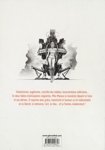 Totalitarisme, eugénisme, contrôle des médias, incarcérations arbitraires. En deux fables d'anticipation cinglantes, Milo Manara le moraliste dépeint le futur et ses dérives. Et exprime avec grâce, inventivité et humour sa foi inébranlable en la liberté, la tolérance, l'art, le rêve et la Femme, évidemment !