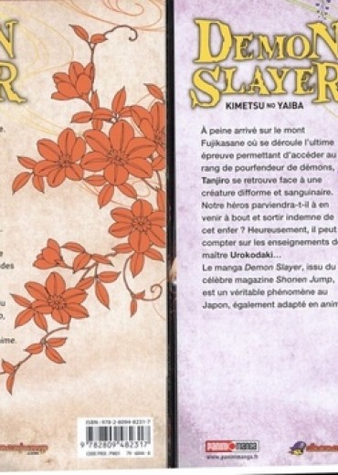 Le Japon, au début du XXe siècle. Tanjiro, un jeune marchand de charbon, mène une vie paisible jusqu'au jour funeste où il découvre que sa famille a été décimée. Sa jeune soeur, Nezuko, est la seule survivante. Mais, depuis cette effroyable tragédie, elle semble possédée... Afin de sauver sa soeur et de venger les siens, Tanjiro entame une longue quête, dans les pas des mystérieux pourfendeurs de démons ! Le manga Demon Slayer, issu du célèbre magazine Shonen Jump, est un véritable phénomène au Japon, également adapté en anime. A peine arrivé sur le mont Fujikasane où se déroule l'ultime épreuve permettant d'accéder au rang de pourfendeur de démons, Tanjiro se retrouve face à une créature difforme et sanguinaire. Notre héros parviendra-t-il b en ¡t venir à bout et sortir indemne de à : cet enfer ? Heureusement, il peut compter sur les enseignements de maitre Urokodaki... Le manga Demon Slayer, issu du célèbre magazine Shonen Jump, est un véritable phénomène au Japon, également adapté en anime.