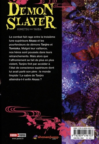 Maintenant que Tanjiro s'est ouvert au "monde limpide", la violence du combat contre Akaza atteint son paroxysme. Les fantômes du passé ressurgissent dans l'esprit torturé de la 3e lune supérieure, dévoilant les raisons qui l'ont poussé à devenir un démon. De son côté, Kanao livre un combat acharné contre Dôma, la 2e lune supérieure. Alors qu'il rejoint Kanao, Inosuke réalise que ce n'est pas la première que son chemin croise celui de Dôma, il fait alors le serment de le tuer. Demon Slayer est le titre de tous les records. Chaque fois que le manga de Koyoharu Gotouge est cité, un nouvel exploit est atteint ! Un an après sa publication en France, le premier tome est entré dans les dix plus grosses ventes de manga en 2020 (Classement Gfk). Le film Le train de l'infini a généré 32, 5 milliards de yens de recette, il a battu le record du box-office au Japon, détrônant ainsi le Voyage de Chihiro ! La chanson thème de l'anime domine aussi les charts nippons...