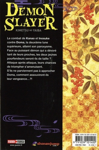 Le combat fait rage entre Doma, la 2e lune supérieure et les pourfendeurs Kanao et Inosuke. Les deux jeunes guerriers, tremblant de colère, parviendront-ils à venger tous ceux que Doma a dévorés ? Non loin de là dans la Forteresse Infinie, Mitsuri Kanroji, le pilier de l'Amour, et Obanai Iguro, le pilier du Serpent, font face à la nouvelle 4ème lune supérieure, tandis que Muichiro Tokito, le pilier de la brume, se retrouve face à la 1ère lune supérieure, qui lui fait une étrange révélation sur sa famille... Demon Slayer est le titre de tous les records, chaque fois que le manga de Koyoharu Gotouge est cité, un nouvel exploit est atteint ! 1 an après sa publication en France, le premier tome est entré dans les dix plus grosses ventes de manga en 2020 (Classement Gfk). Le film Le train de l'infini a généré 32, 5 milliards de yens de recette, il a battu le record du box-office au Japon, détrônant ainsi le Voyage de Chihiro ! La chanson thème de l'anime domine aussi les charts nippons...