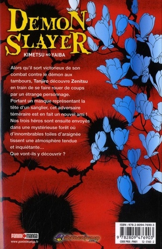 Alors qu'il sort épuisé mais victorieux de son combat contre l'ogre aux tambours, Tanjiro découvre Zenitsu en train de se faire rouer de coups par le mystérieux garçon à tête de sanglier. Sans hésiter, notre héros s'élance pour porter secours à son nouvel ami. Mais qui est cet adversaire redoutable et que veut-il ? Et pourquoi porte-t-il deux sabres du soleil ? Tanjiro ne va pas tarder à le découvrir... Plus tard, une nouvelle mission entraîne Tanjiro et ses acolytes sur le mont Natagumo où les attend une épreuve terrifiante...