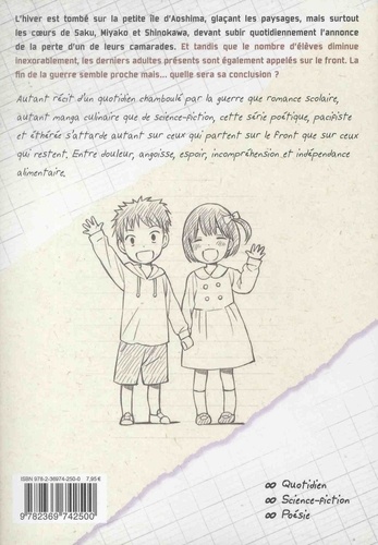 Cruel et poétique à la fois, cet ultime de Dernière Heure apporte une conclusion aussi surprenante qu'ambivalente, à la puissance métaphorique indéniable, et qui ne manquera pas d'interroger les lecteurs sur le sens même de la vie. Une série unique, qui transporte Yû, sa jeune auteure, sur le devant de la scène de la science-fiction. L'hiver est tombé sur la petite île d'Aoshima, glaçant les paysages, mais surtout le coeur de Saku, Miyako et Shinokawa, devant subir quotidionnement l'annonce de la perte d'un de leurs camarades. Et tandis que le nombre d'élève diminue inexorablement, les derniers adultes présents sont également appelés sur le front. La fin de la guerre semble proche mais... quelle sera sa conclusion ?