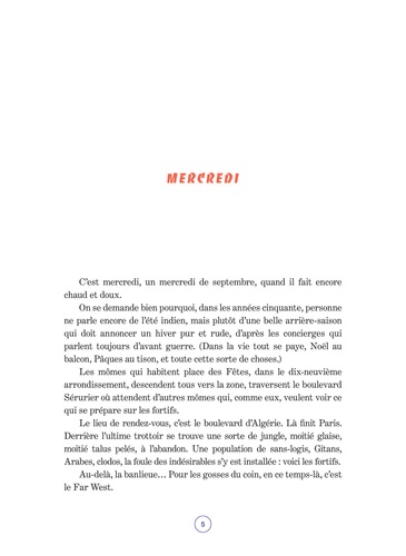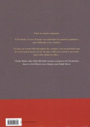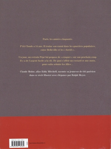 Paris, années cinquante. P'tit Claude a 14 ans. Trop grand pour être encore un enfant, trop petit pour être vraiment un adulte. Pour un peu, il serait nostalgique de sa jeunesse... Ce mercredi de septembre, P'tit Claude s'ennuie. Ce sont les vacances, il n'a rien à faire. Il zone dans le Paris populaire, celui de Belleville et de la Place des Fêtes. Il traîne du côté des "fortifs" , là où vivent ceux que la société rejette. Il s'arrête devant les cinémas et les kiosques à journaux, où s'empilent tous ces illustrés qui le font rêver. Un jour, un certain Pépé leur propose, à lui et à son copain Marcel, de "croquer" sur son prochain coup. Rien à craindre, que du pognon facile à gagner, promet Pépé. Avec cet argent, Claude pourra s'offrir un électrophone et un costard. Peut-être même une moto. Et séduire les filles, enfin... On ne présente plus Eddy Mitchell, Claude Moine, de son vrai nom. "Monsieur Eddy" raconte sa jeunesse de titi parisien. Le texte est agrémenté d'illustrations de Ralph Meyer qui dépeint avec tendresse les déambulations de P'tit Claude. Enfant de l'est de Paris également, le dessinateur d'Undertaker délaisse le temps d'un livre les plaines du Far-west pour explorer celles du 19e arrondissement parisien. Lesquelles ne sont pas forcément moins exotiques ni moins dangereuses !