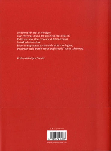 Un homme part seul en montagne. Pour s'élever au-dessus des fantômes de son enfance ? Plutôt pour aller à leur rencontre et descendre dans les tréfonds de son âme. Errance métaphysique au coeur de la roche et de la glace, Descension est le premier roman graphique de Thomas Luksenberg.