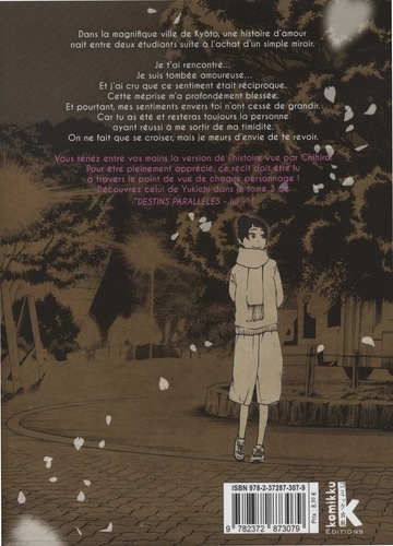 Dans la magnifique ville de Kyoto, une histoire d'amour naît entre deux étudiants suite à l'achat d'un simple miroir. Je t'ai rencontré... Je suis tombée amoureuse... Et j'ai cru que ce sentiment était réciproque. Cette méprise m'a profondément blessée. Et pourtant, mes sentiments envers toi n'ont cessé de grandir. Car tu as été et resteras toujours la personne ayant réussi à me sortir de ma timidité. On ne fait que se croiser, mais je meurs d'envie de te revoir.