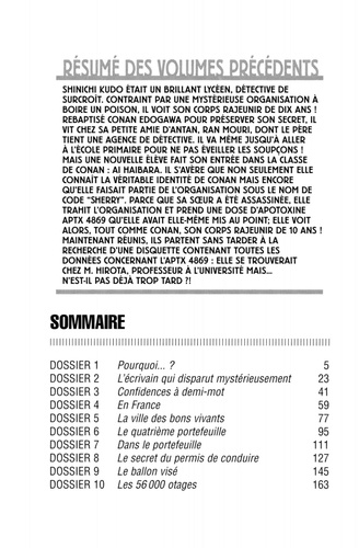 Enigmes principales : L'écrivain qui disparu mystérieusement. La ville des bons vivants. Les 56 000 otages. Ai Haibara est sa nouvelle camarade de classe : tout comme Conan, elle a été victime du terrible poison. Conan et sa "famille" se sont rendus à Osaka sur une invitation de Hattori. Là, Conan et Hattori, confrontés à un tueur en série, font des merveilles et résolvent cette affaire avec brio. Un jour, Conan et sa bande de petits détectives vont assister à un match de foot pendant lequel un homme armé prend en otage tous les spectateurs, menaçant de tuer quelqu'un si une forte somme ne lui est pas versée avant la fin du match. Conan arrivera-t-il à déjouer ce plan en si peu de temps ? Ai révèle un peu plus de sa personnalité. Invité par Heiji, Conan se rend à Osaka et enquête sur un serial-killer...