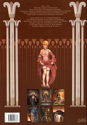 Paris, 1766. Diamante assiste à l'enterrement de sa soeur aînée effroyablement assassinée, cérémonie à l'issue de laquelle une inconnue prétend pouvoir l'informer sur les circonstances mystérieuses qui ont entouré le meurtre. Mais l'enfer est parfois pavé de bonnes intentions ! Jeune femme issue de la haute bourgeoisie, se conformant docilement à ses règles et bienséances, Diamante se trouve dès lors confrontée au monde des libertins, outrage à toutes les conventions de la société, et sur lequel règne en maître le divin marquis, Donatien Alphonse François de Sade !