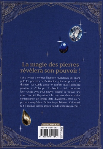 Kai a réussi à contrer l'homme mystérieux qui manipule les pouvoirs de l'antimoine grâce au pouvoir du diamant ! La Guilde arrive en renfort, mais l'assaillant parvient à s'échapper. Akeboshi et Kai continuent leur voyage avec pour nouvel objectif de trouver une arme pour Kai. Ils partent à la rencontre d'un armurier, connaissance de longue date d'Akeboshi, mais ils ne peuvent s'empêcher d'attirer les problèmes... Kai réussira-t-il à sauver la mise grâce à l'un de ses talents cachés ! ?