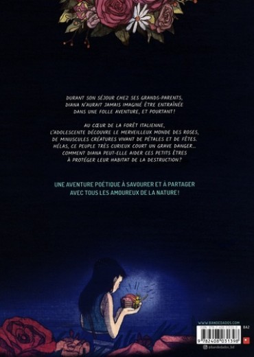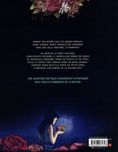 Afin de parfaire les crêpes que prépare la grand-mère de Diana, toutes deux s'enfoncent dans les bois où poussent les fraises qui leur serviront à concocter de la confiture. Rien ne présageait le bouleversement de la journée, sauf peut-être la grande maladresse de Diana, qui, juchée sur une falaise pour cueillir des fruits, tombe soudainement dans la rivière. Lorsque la jeune fille rouvre les yeux, le monde des roses s'étend devant elle. Elle y rencontre Henry, un citoyen du peuple des roses : de minuscules créatures vertes vivant de pétales et de fêtes. Hélas, depuis un certain temps, les petites roses ont perdu leur joie de vivre. Les géants n'arrêtent pas de jeter des détritus sur leur territoire, détruisant ainsi leur magnifique pays. Diana, prenant conscience de faire partie du monde des grandes personnes, propose ses services à la reine des roses. Un merveilleux roman graphique aux couleurs poétiques, évoquant avec sensibilité des thématiques écologiques alarmantes. Diana d'un monde à l'autre est un récit magique bercé par la douceur de l'été italien.
