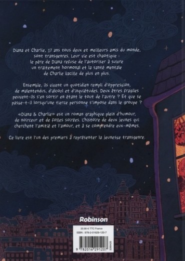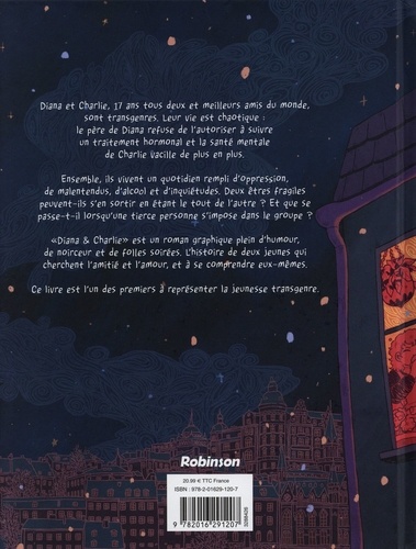 Diana et Charlie sont amis, ils ont 17 ans et sont transgenres. Leur vie est pour le moins chaotique : le père de Diana ne souhaite pas qu'elle suive de traitement hormonal et la santé mentale de Charlie ne tient qu'à un fil. Ils sont soumis à une pression sociale quotidienne et vivent dans l'anxiété. Leurs seuls refuges : l'alcool et la musique ! Ils ne peuvent compter que l'un sur l'autre et sur une amitié sans faille, parfois mise à mal par leurs fragilités respectives. "Diana et Charlie" est un merveilleux roman graphique, une aventure humaine qui parle, avec justesse, humour et sensibilité, d'amitié, d'amour et de la vie.