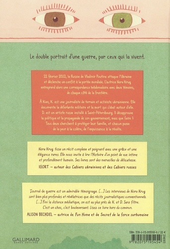 Le double portrait d'une guerre par ceux qui la vivent. 24 février 2022, la Russie de Vladimir Poutine attaque l'Ukraine et déclenche un conflit à la portée mondiale. L'autrice Nora Krug entreprend alors une correspondance hebdomadaire avec deux témoins, de chaque côté de la frontière. A Kiev, K. est une journaliste de terrain et activiste ukrainienne. Elle documente la déferlante militaire et la mort qui s'abat autour d'elle. D. est un artiste russe installé à Saint-Pétersbourg. Il désapprouve la politique et la propagande de son gouvernement, mais que faire ? Tous deux cherchent à protéger leur famille, et chacun passe de la peur à la colère, de l'impuissance à la révolte.