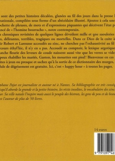 Ces chroniques revisitées de quelques lignes dévoilent mille et une saouleries insolites, délirantes, terribles, tragiques ou mortelles. Dans ce Dico de la cuite à faire pâlir Robert et Larousse accoudés au zinc, ne cherchez pas l'exhaustivité au fil de ce parcours éthyl'hic, il n'y en a pas. Des histoires, des mots et des expressions de bistrot naissent aussi vite que les verres se vident. Si tu peux rhabiller les mariés, Gaston, les mouettes ont pied ! Bienvenue en ces pages écrites à jeun ou presque et sachez qu'à la sortie de ce dictionnaire des murges, notre cellule de dégrisement est gratuite. Ici, c'est happy hour à toutes les pages. Par Stéphane Pajot, journaliste et écrivain, auteur de plus de 45 livres. Des polars, des chroniques, des livres sur la petite et la grande histoire de Nantes, des bistrots et des gens du peuple.